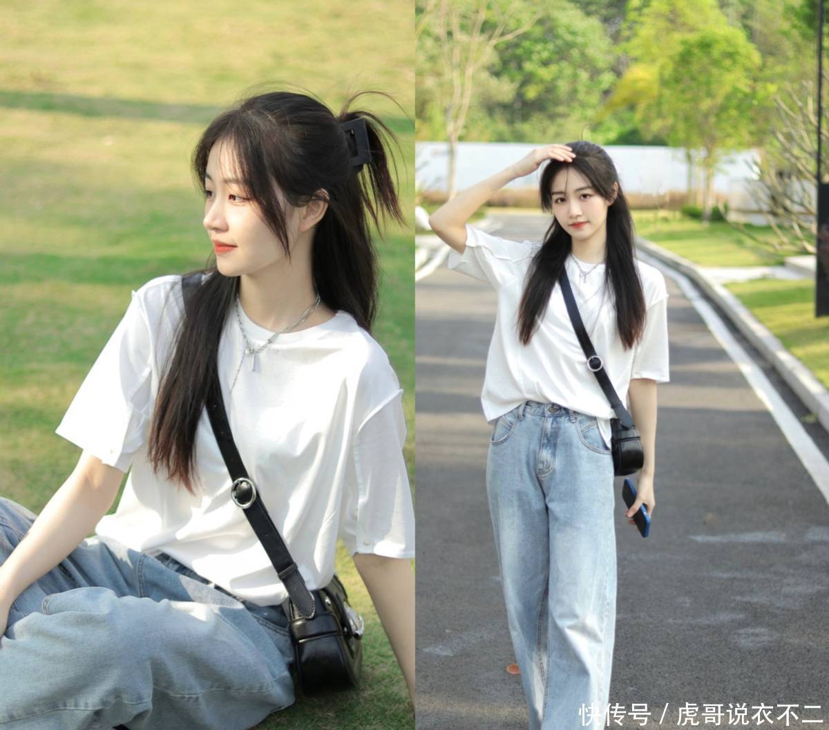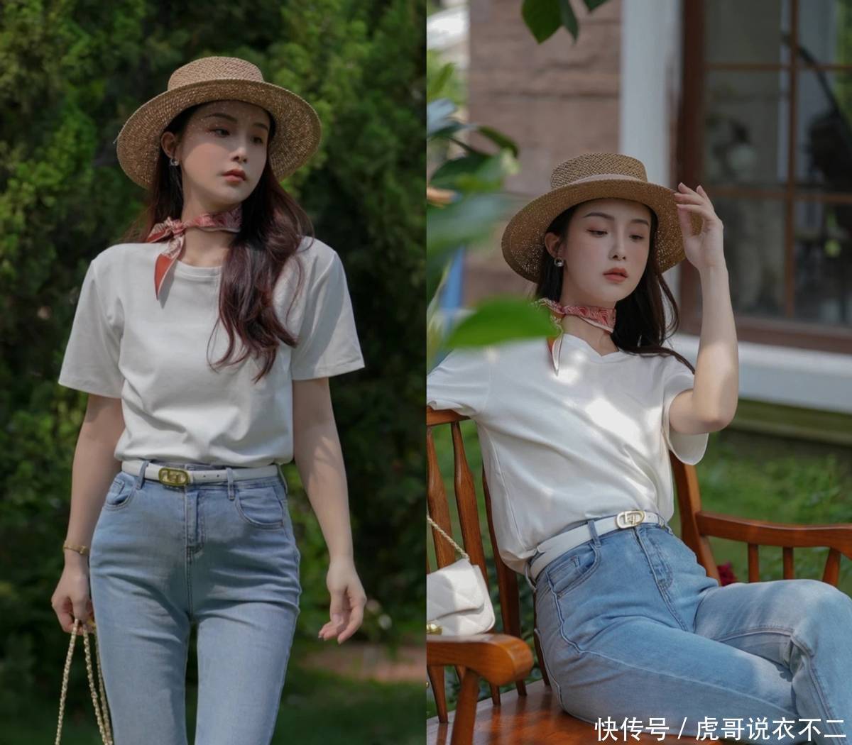 白色T恤是一款看起来就比拟浅易的衣饰,和蓝色牛仔裤的筹商,也从来不会显得花哨,或者是带有各式视觉方面的狼籍感,不同庚岁的女性皆不错尝试。