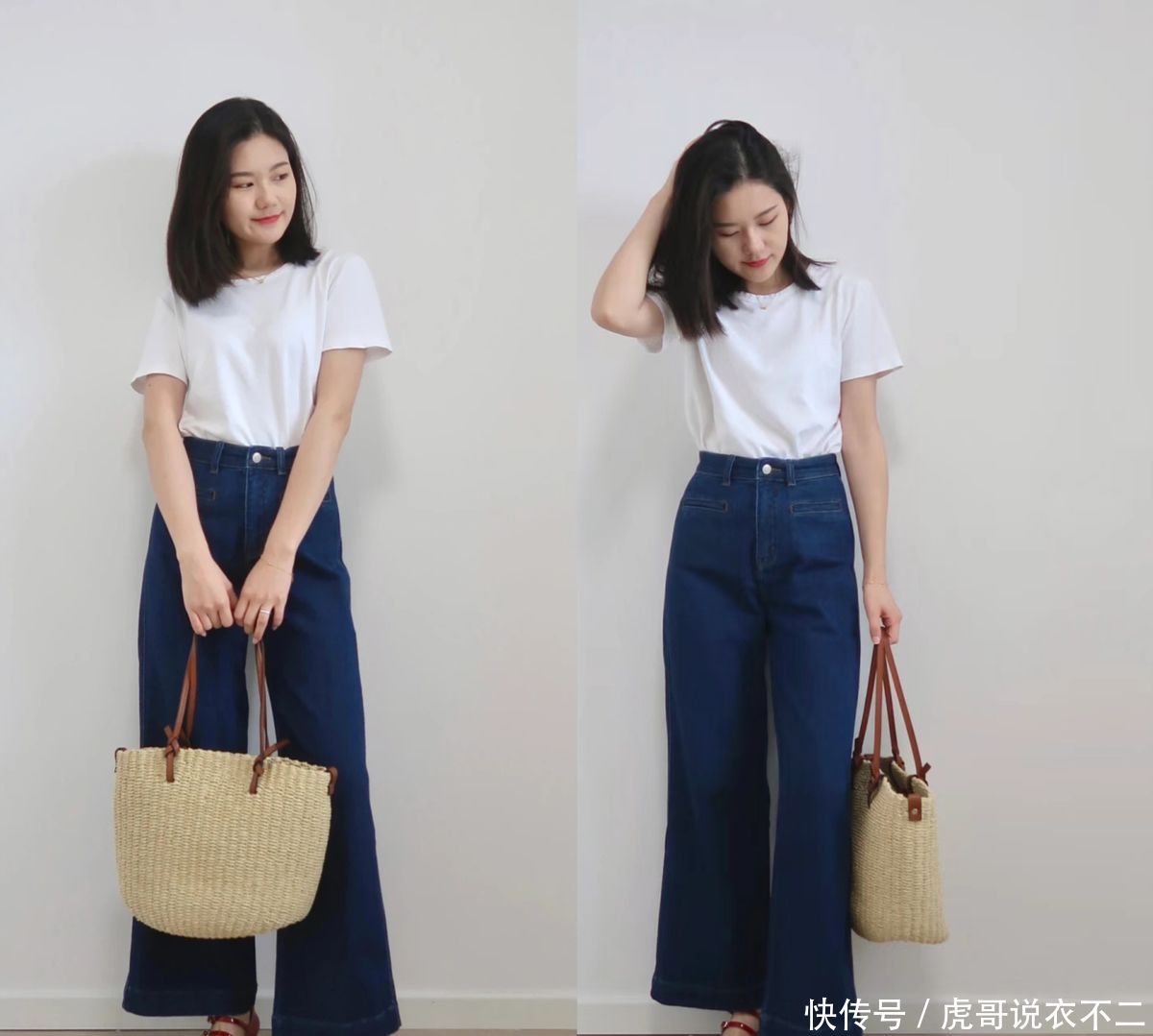 这款深蓝色的牛仔阔腿裤,它就会让女性的气场提高,还不错在上半身搭配修身少许的白色T恤,由此构造出视觉对比,更显得腿长、上半身纤细。